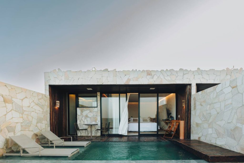 A experiência é pensada para desacelerar: áreas comuns abertas, piscinas que se estendem visualmente até o horizonte e uma proposta que valoriza o ritmo local. O design organiza o espaço para que a paisagem conduza a estadia.